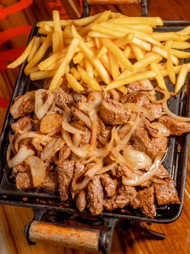Filé cortado à palito com cebola e batata frita.